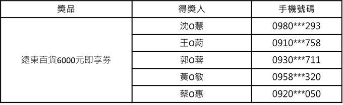 感謝您熱情參與安達人壽舉辦的「申辦保費自動扣繳季季抽好禮」獎勵活動,2025/10得獎名單如下,恭喜以下幸運得獎人 :